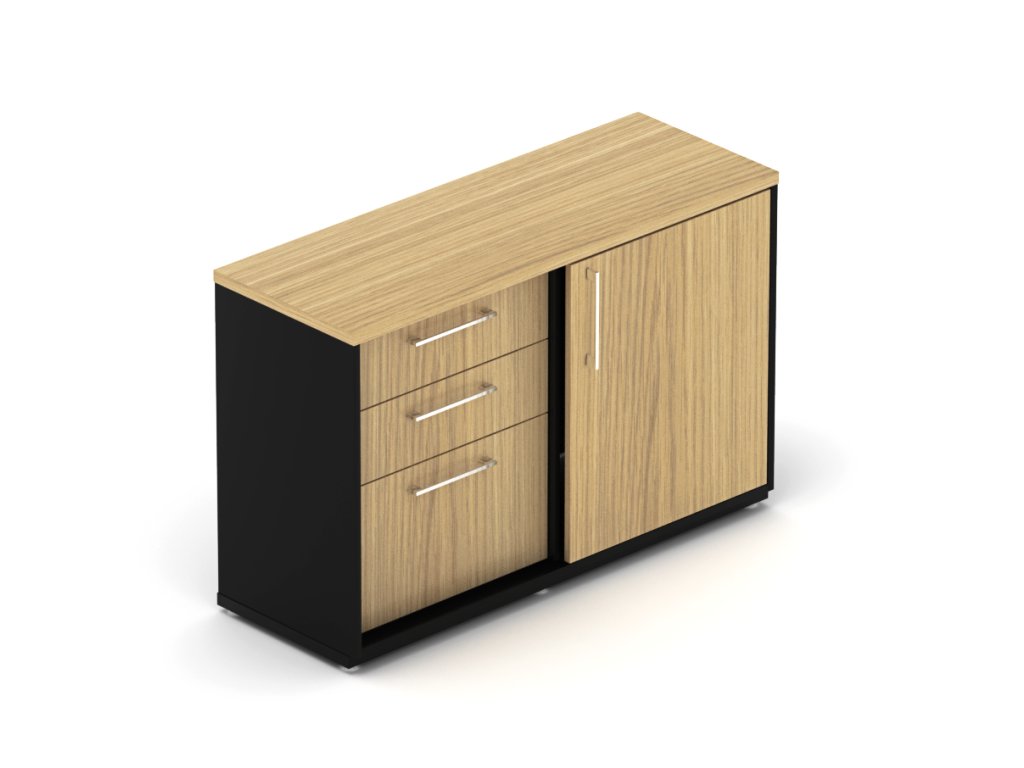 Kancelářská skříň s 2 policemi a 3 zásuvkami, výškou 77,7cm a šířkou 120cm, dveře posuvné