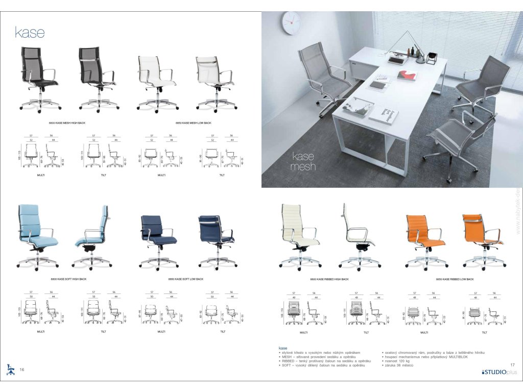 Kancelářská židle KASE - RIBBED LOW BACK Kancelářská židle KASE - RIBBED LOW BACK kancelářská židle s tenkým prošívaným čalounem na sedáku a opěráku, středně vysoký opěrák, ocelový chromovaný rám s područkami, houpací mechanismus s nastavením síly protiváhy a aretací v základní pozici, za příplatek mechanismus Multiblok s několikanásobnou aretací a předsunutou osou houpání pro vyšší komfort, aluminiová leštěná báze, nosnost 150 kg, záruka 60 měsíců Židli lze objednat pouze v látkách BO, SK. Příplatek za mechanismus Multiblock 998 Kč. Hmotnost: 12,6 kg Kancelářská židle KASE - RIBBED LOW BACK je ideální volbou pro ty, kteří hledají stylovou a pohodlnou kancelářskou židli. Ergonomický design, nastavitelná opěrka hlavy a výškově nastavitelné područky přispívají k maximálnímu komfortu. S touto židlí dosáhnete nejen pohodlného, ale i zdravého sezení, což zvyšuje vaši efektivitu a celkový komfort při práci.